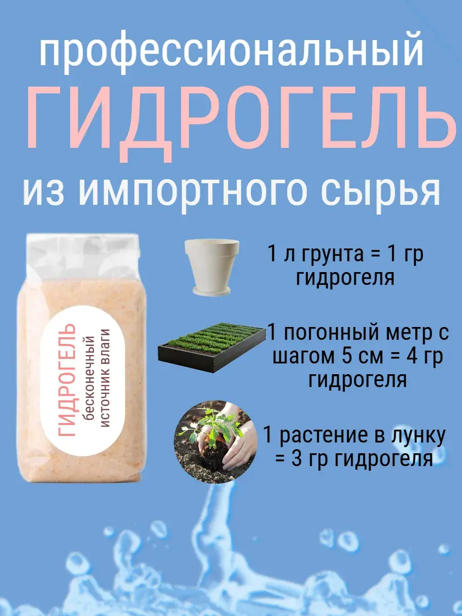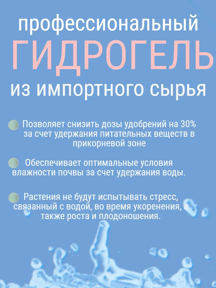 Уменьшает потребность в частых поливах. Ограничение орошения после использования гидрогеля составляет от 20% до 50% в зависимости от почвы.