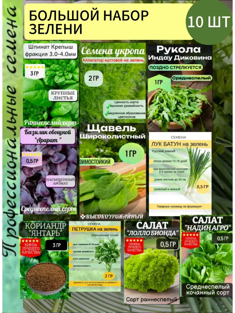 10 пакетиков семян разной зелени