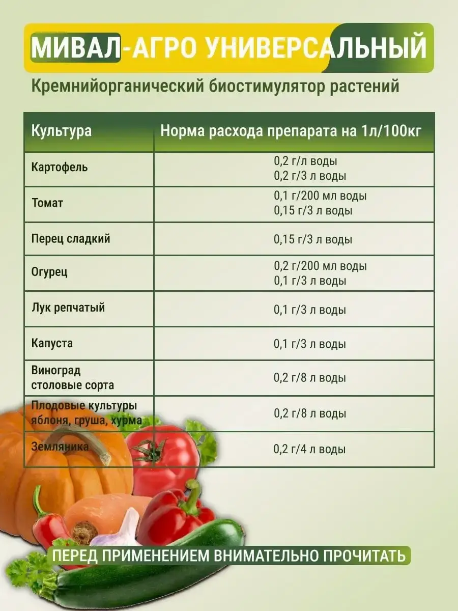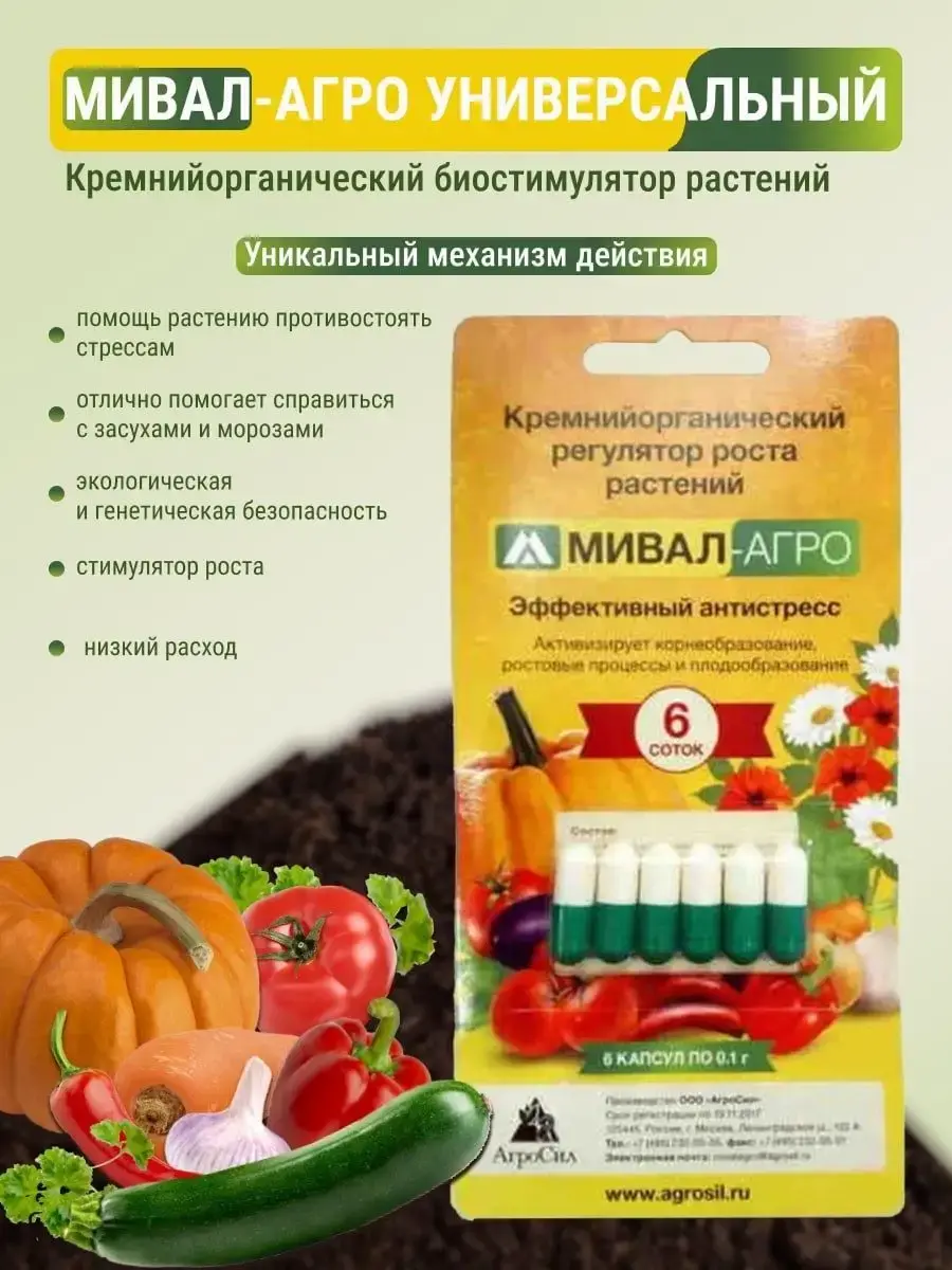 Мивал-Агро регулятор роста растений 0,6 г, это 6 капсул по 0.1 грамм, каждая капсула на 1 сотку - помогает решить одну из важнейших проблем в агрономии на данный момент – отрицательное влияние стрессовых факторов на растение. Мивал-Агро выполняет сразу несколько важных функций: в первую очередь это защита от неблагоприятных воздействий окружающей среды, снятие стрессовой нагрузки с растения, а также улучшение транспорта питательных элементов и ускорение обменных процессов внутри клетки.