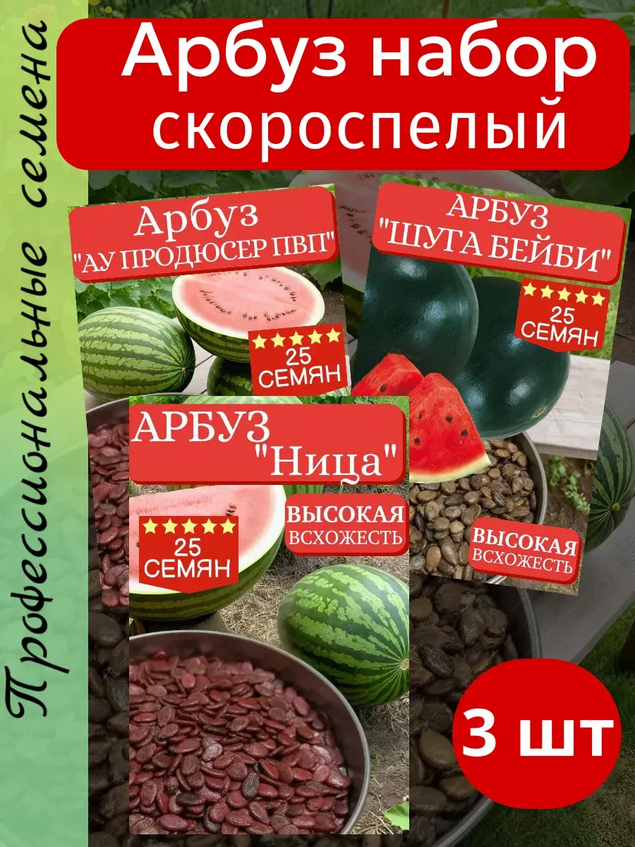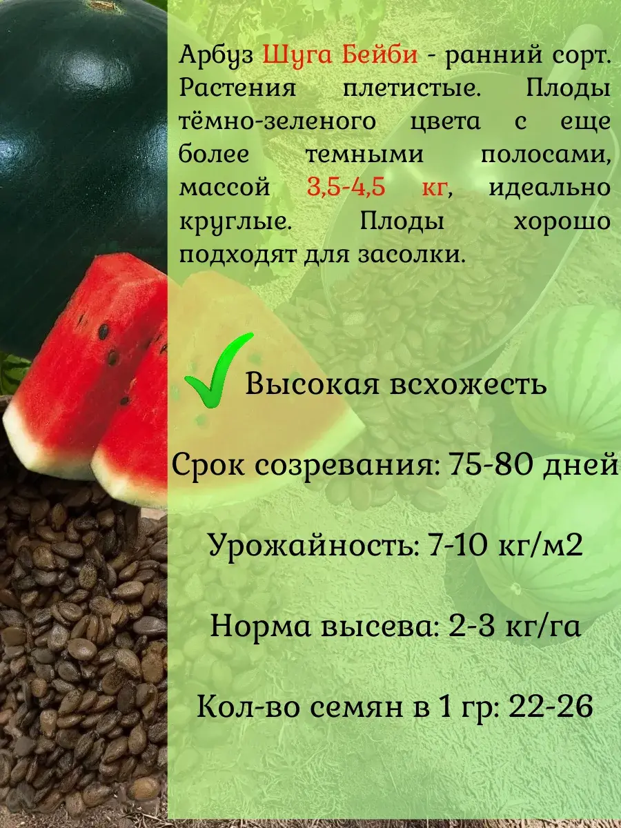 Арбуз Шуга Бейби. Предназначен для выращивания в пленочных теплицах. Растения плетистые. Плоды тёмно-зеленого цвета с еще более темными полосами, массой 3,5-4,5 кг, идеально круглые. Плоды хорошо подходят для засолки. Посев семян на рассаду проводят в конце апреля. Растения подвязывают к шпалере, до высоты 50 см удаляют все боковые побеги, последующие прищипывают над 1-3 листом. Полив умеренный, особенно в период созревания плодов. Сорт неприхотоливый и его можно выращивать в северных районах страны.