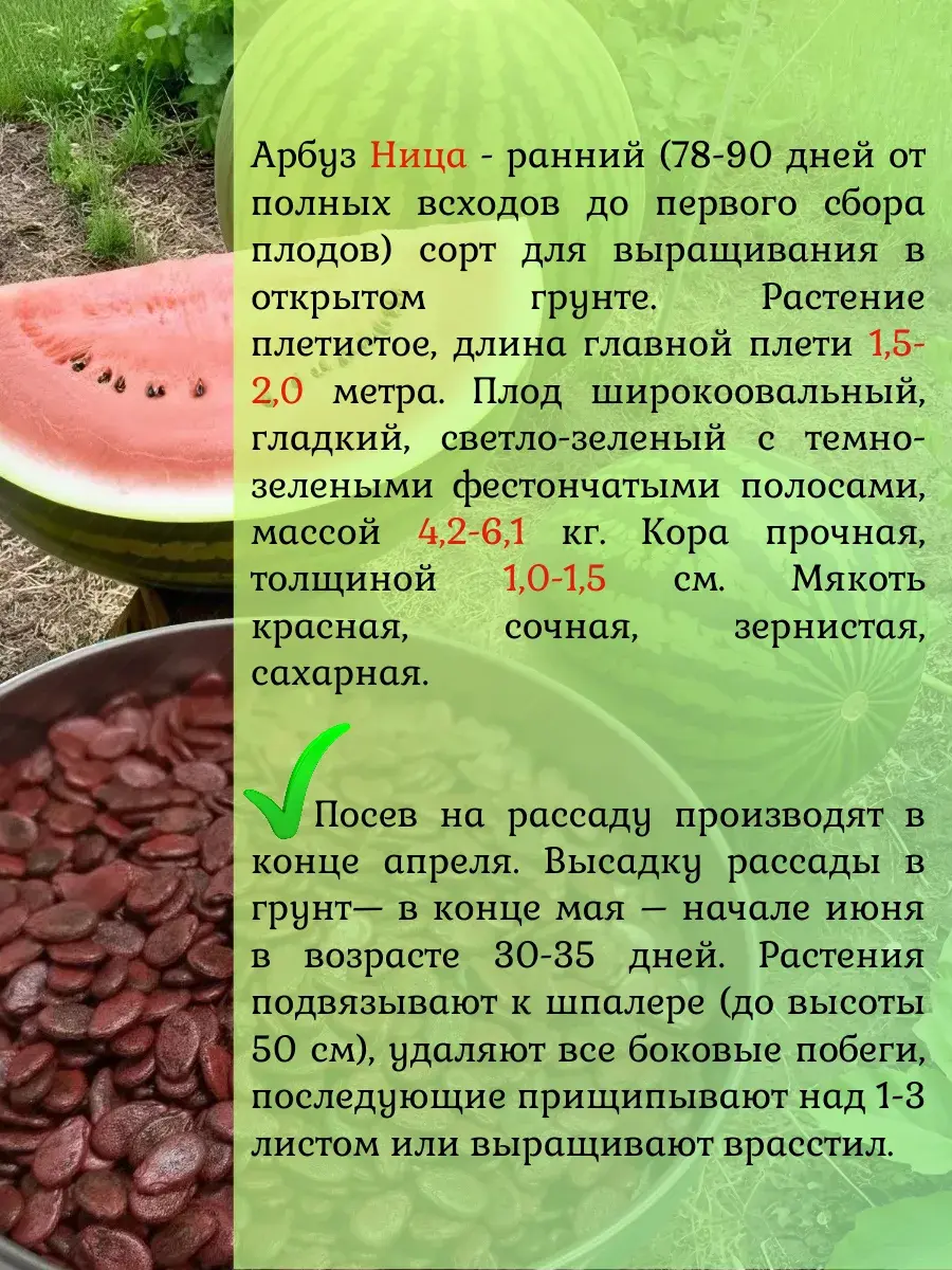 Арбуз Ница. Ранний (78-90 дней от полных всходов до первого сбора плодов) сорт для выращивания в открытом грунте в средней полосе и на юге России. Растение плетистое, длина главной плети 1,5-2,0 метра. Плод широкоовальный, гладкий, светло-зеленый с темно-зелеными фестончатыми полосами, массой 4,2-6,1 кг. Кора прочная, толщиной 1,0-1,5 см. Мякоть красная, сочная, зернистая, сахарная. Сорт отличается высокой лежкостью и транспортабельностью, среднеустойчив к фузариозу и антракнозу. Посев на рассаду производят в конце апреля. Высадку рассады в грунт— в конце мая – начале июня в возрасте 30-35 дней. Растения подвязывают к шпалере (до высоты 50 см), удаляют все боковые побеги, последующие прищипывают над 1-3 листом или выращивают врасстил.