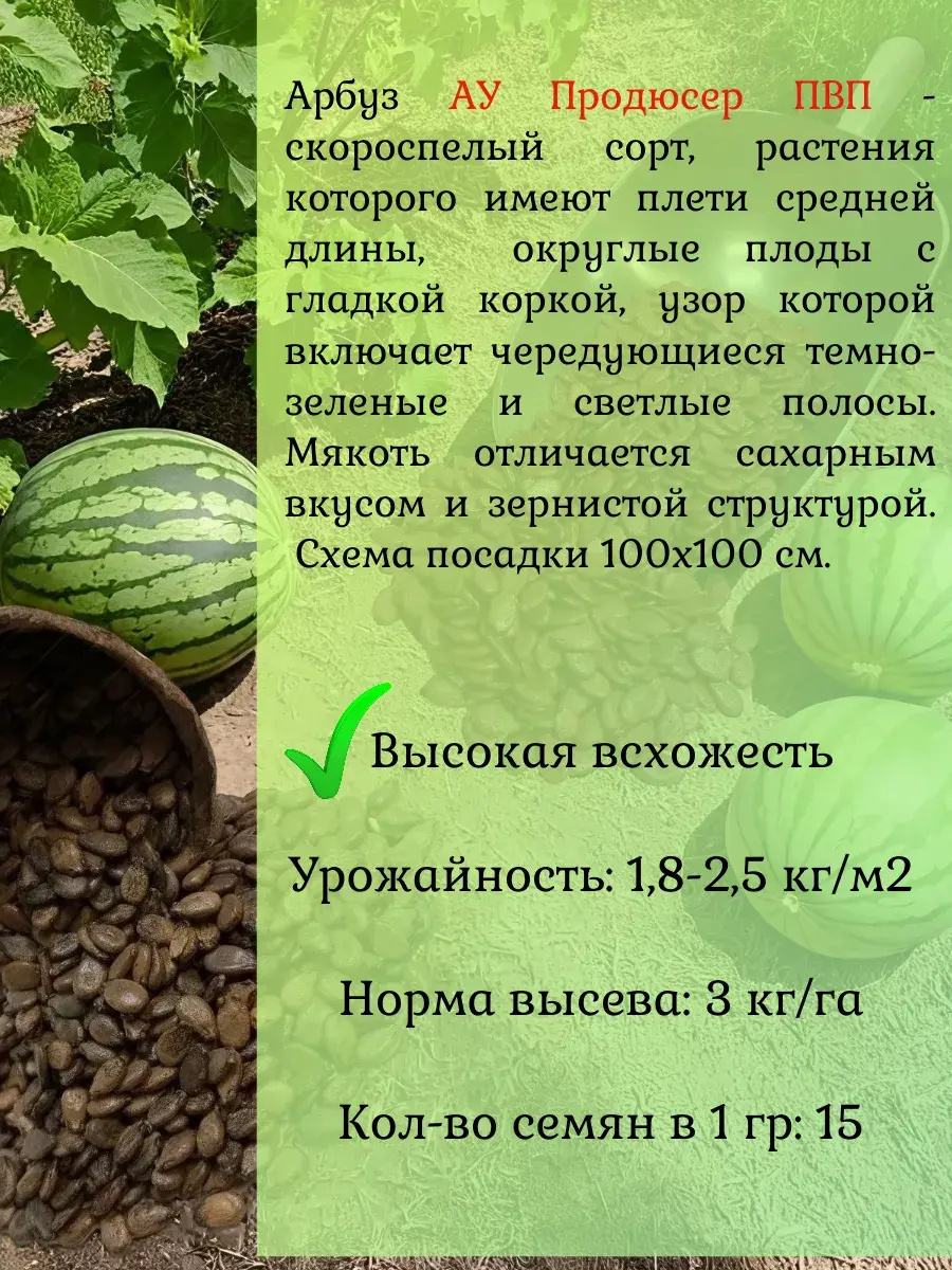 Арбуз АУ Продюсер ПВП. Скороспелый сорт, растения которого имеют плети средней длины, серо-зеленые листья умеренного рассечения и округлые плодыс гладкой коркой, узор которой включает чередующиеся темно-зеленые и светлые полосы.Кора ягод тонкая и имеет белый оттенок на срезе, мякоть отличается сахарным вкусом и зернистой структурой.Посев на рассаду в начале мая. Высадка рассады в открытый грунт в конце мая – начале июня (через 30-35 дней после всходов, в фазе 3-4-х настоящих листьев). Схема посадки 100х100 см. При выращивании под пленочными укрытиями растения формируют в один стебель (удаляют все боковые побеги до высоты 50 см, последующие прищипывают над 1-3 листом), подвязывают к шпалере (плоды нужно подвешивать в сетках).