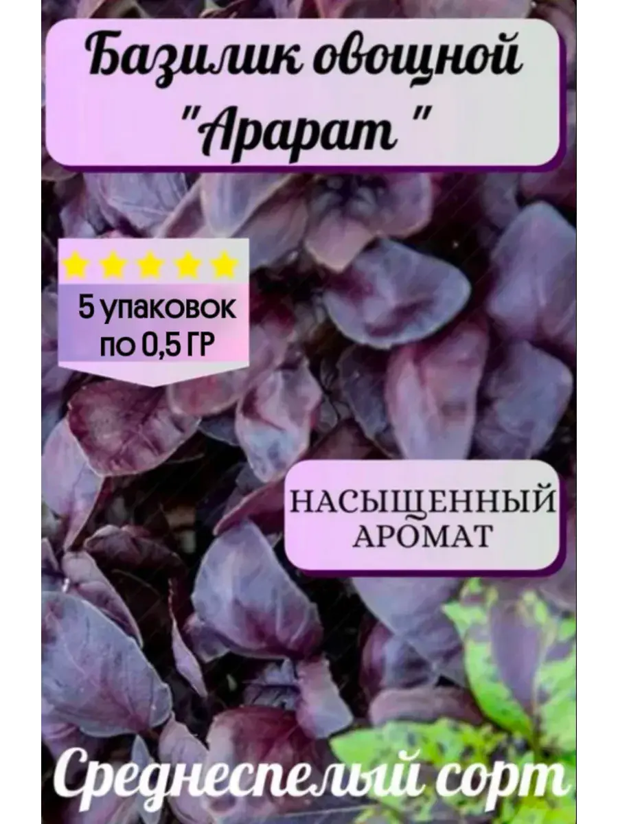 Семена Базилика Арарат - среднеспелый сорт. Период от полных всходов до начала цветения 76 дней. Растение прямостоячее, полураскидистое, высотой до 55 см, средней компактности, побеги приподнятые. Масса одного растения 25-38 г. Листья черешковые, удлиненно-яйцевидные, средней величины, край листа мелкозубчатый, зеленые. Листья и побегибогаты эфирными маслами и фитонцидами, обладают сильным ароматом. Цветки белые. Ценность сорта: листья и побеги богаты эфирными маслами и фитонцидами, обладают сильным ароматом.