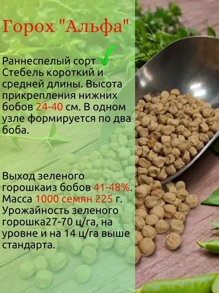 Горох Альфа-2. Раннеспелый. Лущильный. Период от полных всходов до начала технической спелости горошка41-49 дней, на уровне стандарта Альфа. Дружносозревающий. Стебель короткий и средней длины. Листья обычного типа, листочки крупные до очень крупных, зеленые с сероватым оттенком и восковым налетом.Прилистники средние и крупного размера с восковым налетом и пятнистостью средней интенсивности до сильной. Цветки белые, крупные. Бобы изогнутые, длинные, средней ширины, в технической спелости — зеленые до темно-зеленых. Высота прикрепления нижних бобов 24-40 см. В одном узле формируется по два боба. Выход зеленого горошкаиз бобов 41-48%. Горошекв технической спелости темно-зеленый. Вкусовые качества свежего горошкаотличные. Семена морщинистые, среднего размера. Масса 1000 семян 225 г. Урожайность зеленогогорошка27-70 ц/га, на уровне и на 14 ц/га выше стандарта. Пригоден для механизированной уборки.