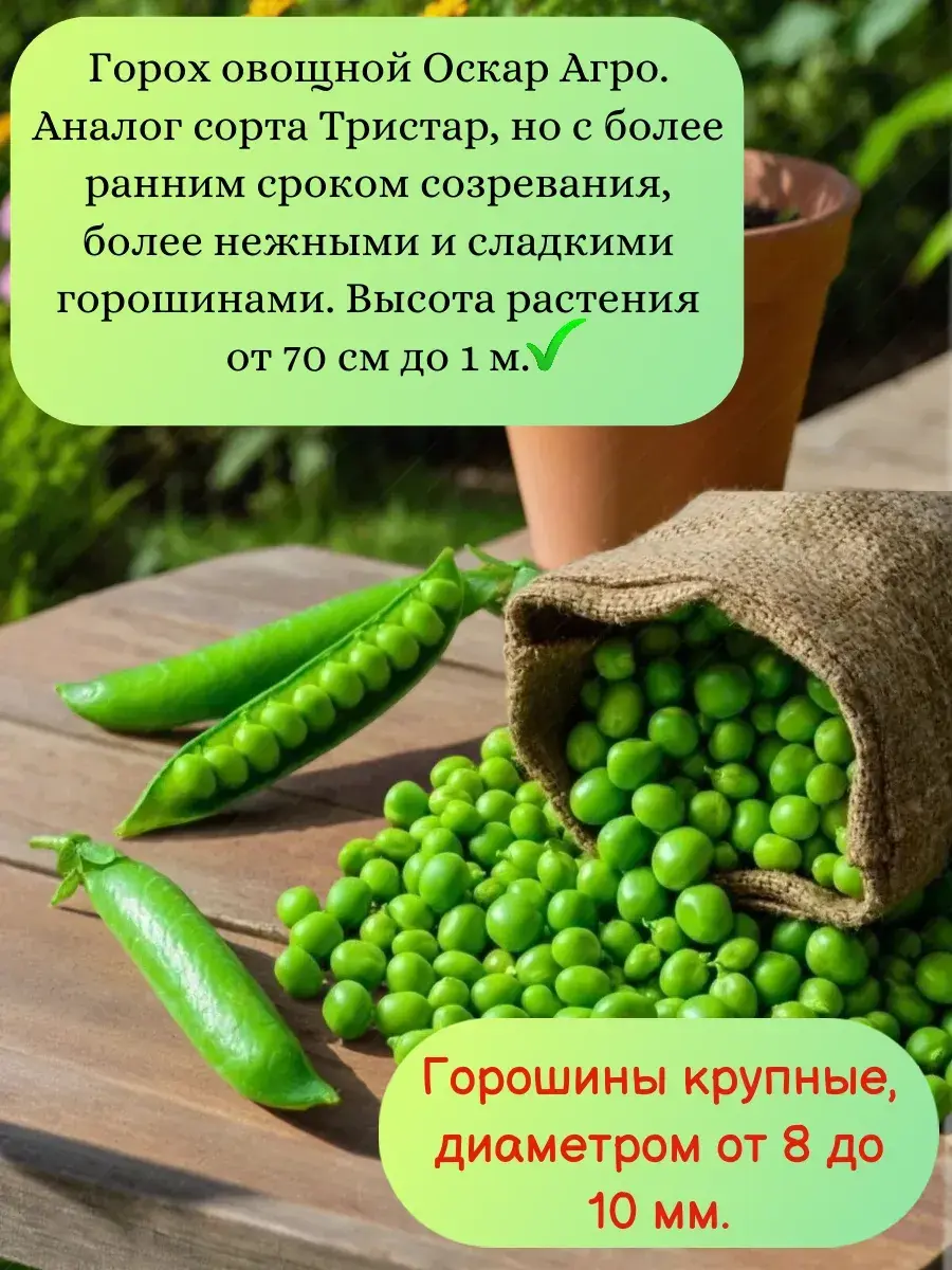 Горох Оскар Агро - среднеспелый сахарный сорт. Горох овощной Оскар Агро. Аналог сорта Тристар, но с более ранним сроком созревания, более нежными и сладкими горошинами. Высота растения от 70 см до 1 м. Первое соцветие формируется над 7-8 листом, в каждом по 2-3 лопатки. Горошины крупные, диаметром от 8 до 10 мм. Боб-лопатка изогнутой формы с острой верхушкой, средней длины, широкий, зеленый. Пергаментный слой отсутствует на ранних стадиях развития. Обладает высокой устойчивостью к болезням.Посев в открытый грунт в конце апреля — начале мая на глубину 3–4 см по схеме 30 х 15 см. Для продолжительного и обильного плодоношения необходим своевременный полив, регулярная прополка, рыхление и подкормка минеральными удобрениями. Собирают урожай по мере созревания.