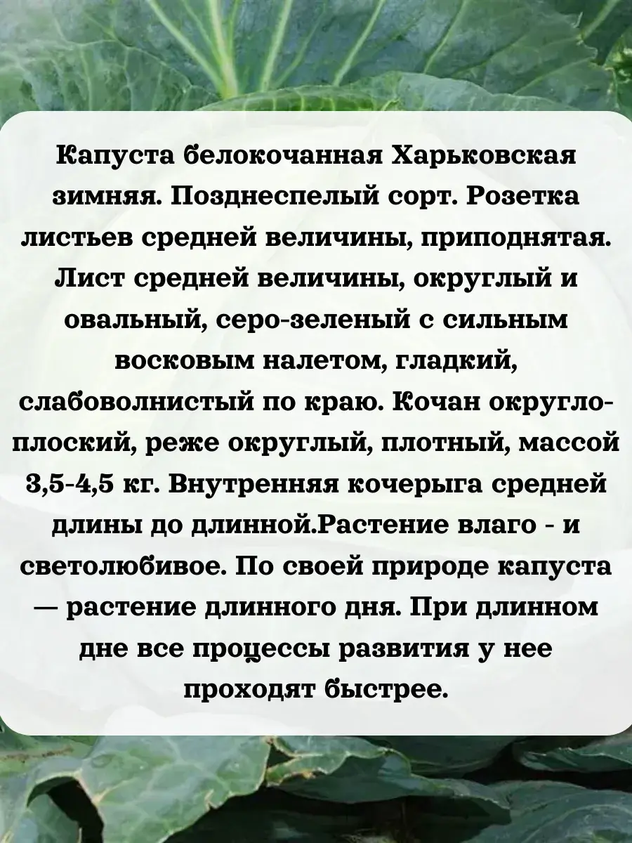 Капуста белокочанная Харьковская зимняя. Позднеспелый сорт. Розетка листьев средней величины, приподнятая. Лист средней величины, округлый и овальный, серо-зеленый с сильным восковым налетом, гладкий, слабоволнистый по краю. Кочан округло-плоский, реже округлый, плотный, массой 3,5-4,5 кг. Внутренняя кочерыга средней длины до длинной.Растение влаго - и светолюбивое. По своей природе капуста — растение длинного дня. При длинном дне все процессы развития у нее проходят быстрее. Почвы предпочтительны хорошо проницаемые, плодородные, с нейтральной реакцией. Кислые почвы непригодны, так как растения на них поражаются килой.Кочаны устойчивы к растрескиванию. Устойчив к серой гнили и точечному некрозу.Посев 20 марта-10 апреля, высадка рассады 5-15 мая, схема посева 60 х 60 см, уборка урожая 20 августа-15 сентября.Урожайность:5,8-8,3 кг/м2.