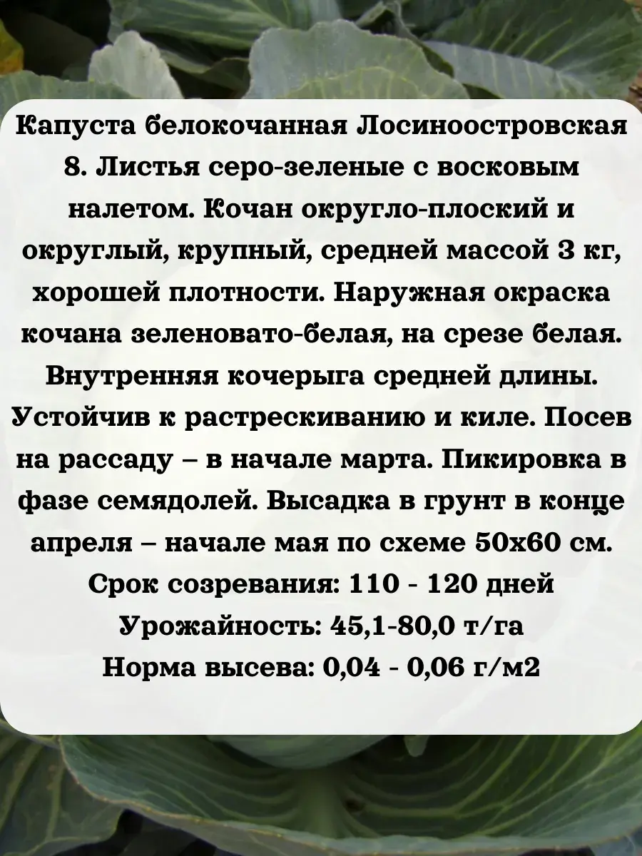 Среднеспелый сорт - семена Капусты белокочанной Лосиноостровская 8. Листья серо-зеленые с восковым налетом. Кочан округло-плоский и округлый, крупный, средней массой З кг, хорошей плотности. Наружная окраска кочана зеленовато-белая, на срезе белая. Внутренняя кочерыга средней длины. Устойчив к растрескиванию и киле. Посев на рассаду – в начале марта. Пикировка в фазе семядолей. Высадка в грунт в конце апреля – начале мая по схеме 50х60 см.