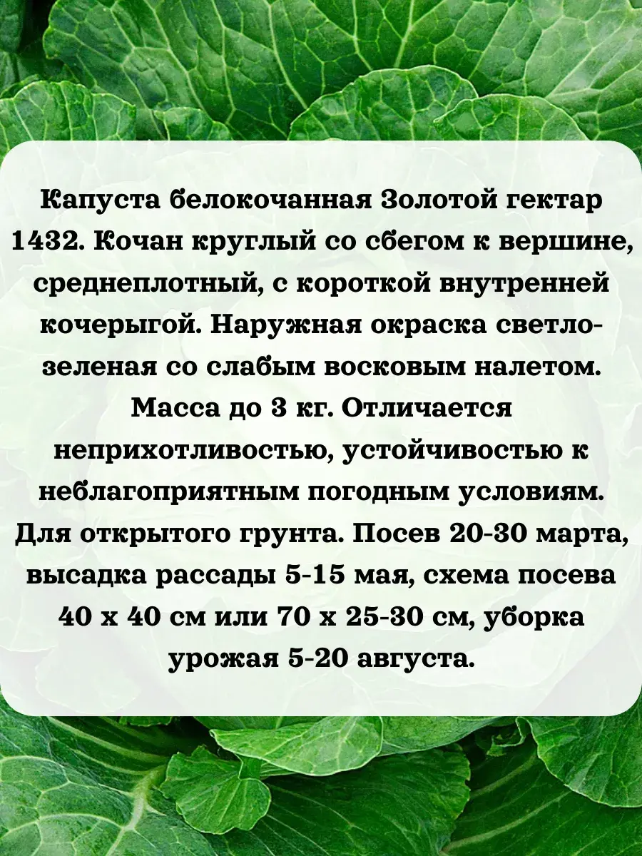 Капуста белокочанная Золотой гектар 1432. Кочан круглый со сбегом к вершине, среднеплотный, с короткой внутренней кочерыгой. Наружная окраска светло-зеленая со слабым восковым налетом. Масса до 3 кг. Отличается неприхотливостью, устойчивостью к неблагоприятным погодным условиям. Для открытого грунта. Посев 20-30 марта, высадка рассады 5-15 мая, схема посева 40 х 40 см или 70 х 25-30 см, уборка урожая 5-20 августа.