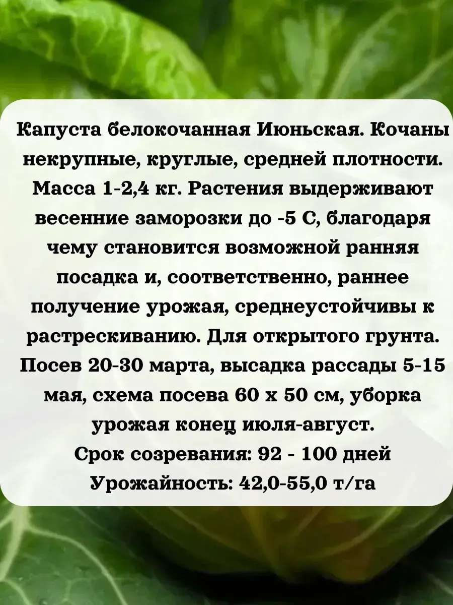 Капуста белокочанная Июньская. Кочаны некрупные, круглые, средней плотности. Масса 1-2,4 кг. Растения выдерживают весенние заморозки до -5 С, благодаря чему становится возможной ранняя посадка и, соответственно, раннее получение урожая, среднеустойчивы к растрескиванию. Для открытого грунта. Посев 20-30 марта, высадка рассады 5-15 мая, схема посева 60 х 50 см, уборка урожая конец июля-август.