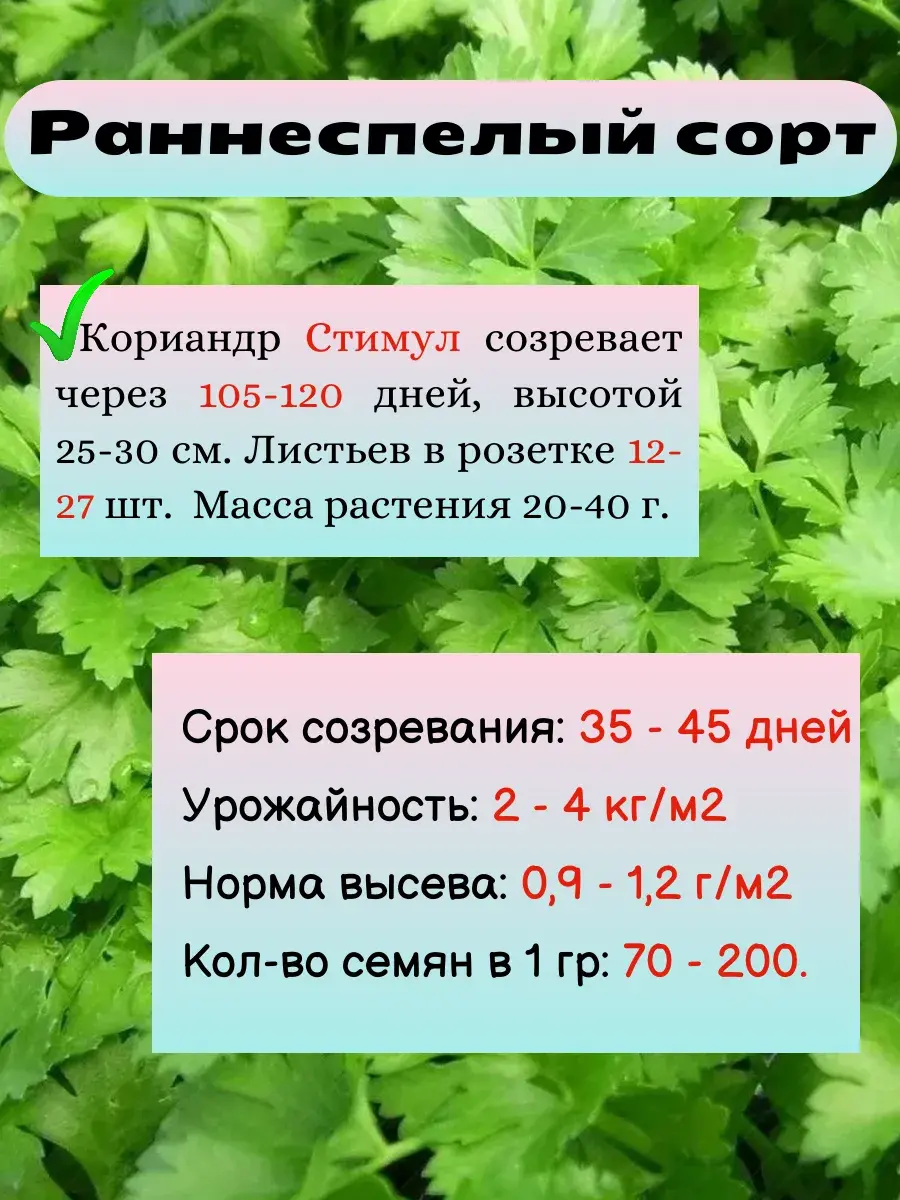 Кориандр Стимул - отличный выбор для тех, кто ценит свежие и ароматные травы в своем саду и огороде. Этот сорт отличается высокой урожайностью, что позволит вам наслаждаться свежим кориандром на протяжении всего сезона. Семена созревают через 105-120 дней. Розетка растения компактная, прямостоячая, густооблиственная, высотой 25-30 см. Листьев в розетке 12-27 шт. Лист двоякоперисторассеченный, темно-зеленый, глянцевый. Масса растения 20-40 г. Предпочитает нейтральные супесчаные легкие почвы, хорошо заправленные гумусом. Любит полив и солнечные места на грядках. В засуху, при загущении посадок и недостатке света быстро зацветает и не дает хорошей розетки листьев. Сеять не загущая посадок, на расстоянии 3-5 см. Сеют на глубину 2-3 см. После появления 3-4-го листа прореживают на расстояние 10 см.
