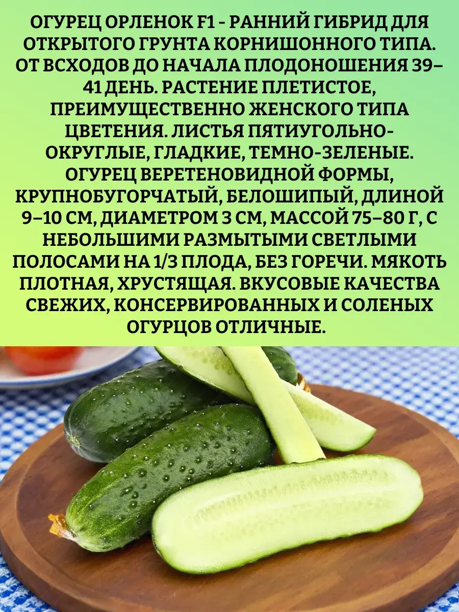 Огурец раннеспелый гибрид открытого грунта Орлёнок F1 -2 гр . Огурец Орленок F1 - ранний гибрид для открытого грунта корнишонного типа. От всходов до начала плодоношения 39–41 день. Растение плетистое, преимущественно женского типа цветения. Листья пятиугольно-округлые, гладкие, темно-зеленые. Огурец веретеновидной формы, крупнобугорчатый, белошипый, длиной 9–10 см, диаметром 3 см, массой 75–80 г, с небольшими размытыми светлыми полосами на 1/3 плода, без горечи. Мякоть плотная, хрустящая. Вкусовые качества свежих, консервированных и соленых огурцов отличные. Отличается дружностью плодоношения и высоким выходом товарной продукции. Огурец Орленок F1 устойчив к мучнистой (Px) и ложной мучнистой росе (Pcu), вирусу огуречной мозаики (CMV-1), кладоспориозу (Ccu) . Устойчив к засухе. Рекомендуется для свежего потребления, засолки и консервирования. Схема посева 70х30 см. Урожайность 10–12 кг/м2.