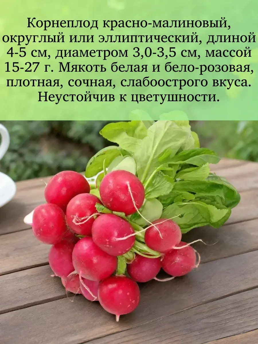 Корнеплод красно-малиновый, округлый или эллиптический, длиной 4-5 см, диаметром 3,0-3,5 см, массой 15-27 г. Мякоть белая и бело-розовая, плотная, сочная, слабоострого вкуса. Неустойчив к цветушности. Выращивают в открытом грунте и под пленкой. Посев производят в бороздки глубиной 0,5-1,5 см, по схеме 4-5x15 см. Лучшие почвы - рыхлые, плодородные, супесчаные и суглинистые. Посев семян в открытый грунт: начало апрель — средина август .